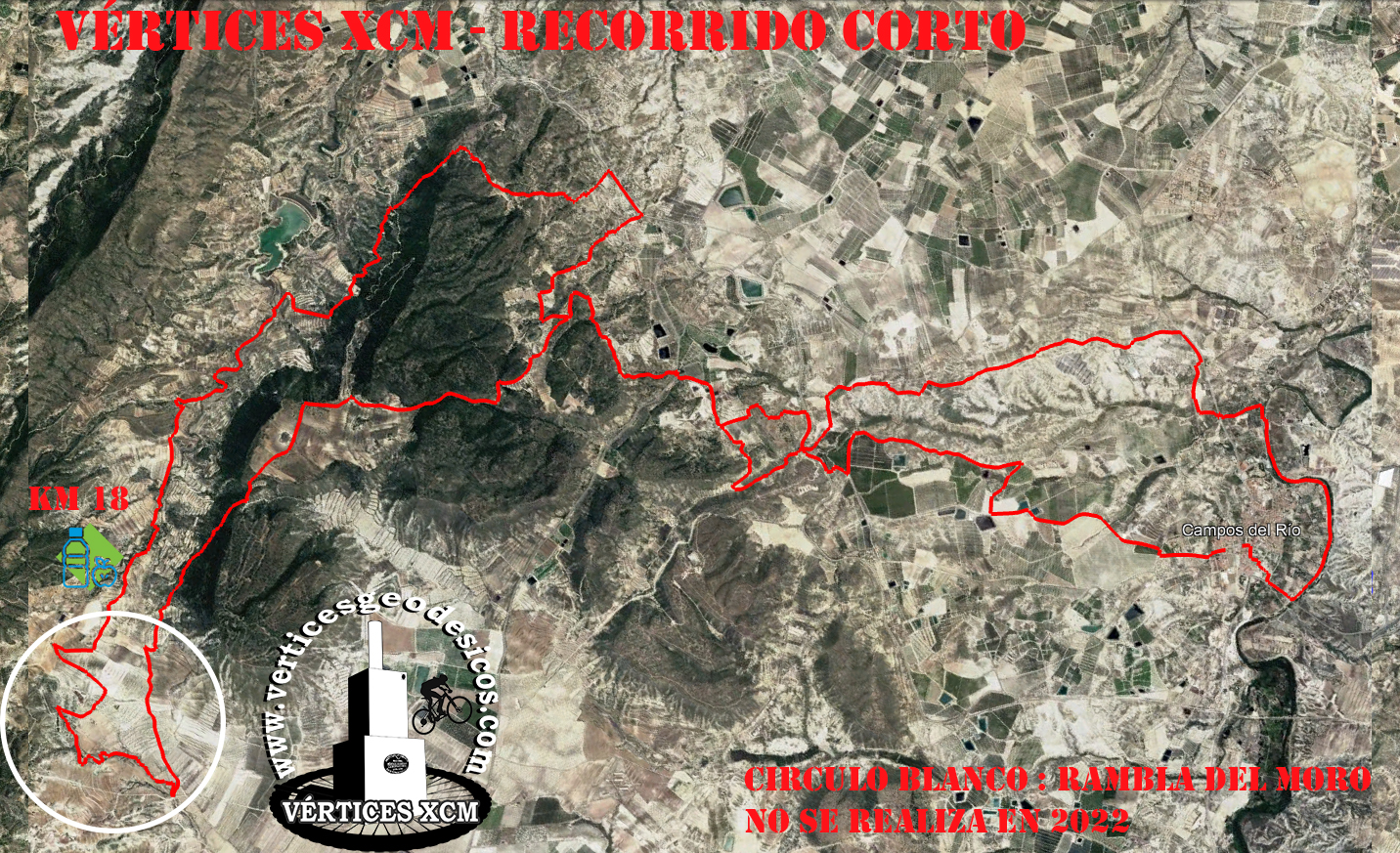 El recorrido comienza en la Avenida de la Constitución (paseo central del pueblo de Campos del Río y del evento), continua calle estación y calle tarifa, sale del pueblo y continua por camino rural asfaltado para estirar el grupo, en el km 2.6 entramos en caminos rurales, en el km 7 llegamos al cruce de la carretera de Yechar a Archena (RM-530). Por senda nos adentraremos en la Sierra de Cotos y Coronas para bajar de nuevo al trasvase, tras unos pocos cientos de metros, nos dirigimos hacia la senda denominada "Araña Gatos", despues rambla Mayés y Rambla Moro, para subir de nuevo a la Sierra por la senda denominada "la cicatriz". Cruzamos la carretera y por pista rápida llegamos el río Mula en el Km 37, en este punto, la ruta corta irá hacia meta y la ruta larga se dirigirá a las zonas lunares subiendo por la denominada "Mejillonera", continuaremos con subidas y bajadas cortas pero intensas, la zona auténticamente campera.