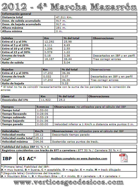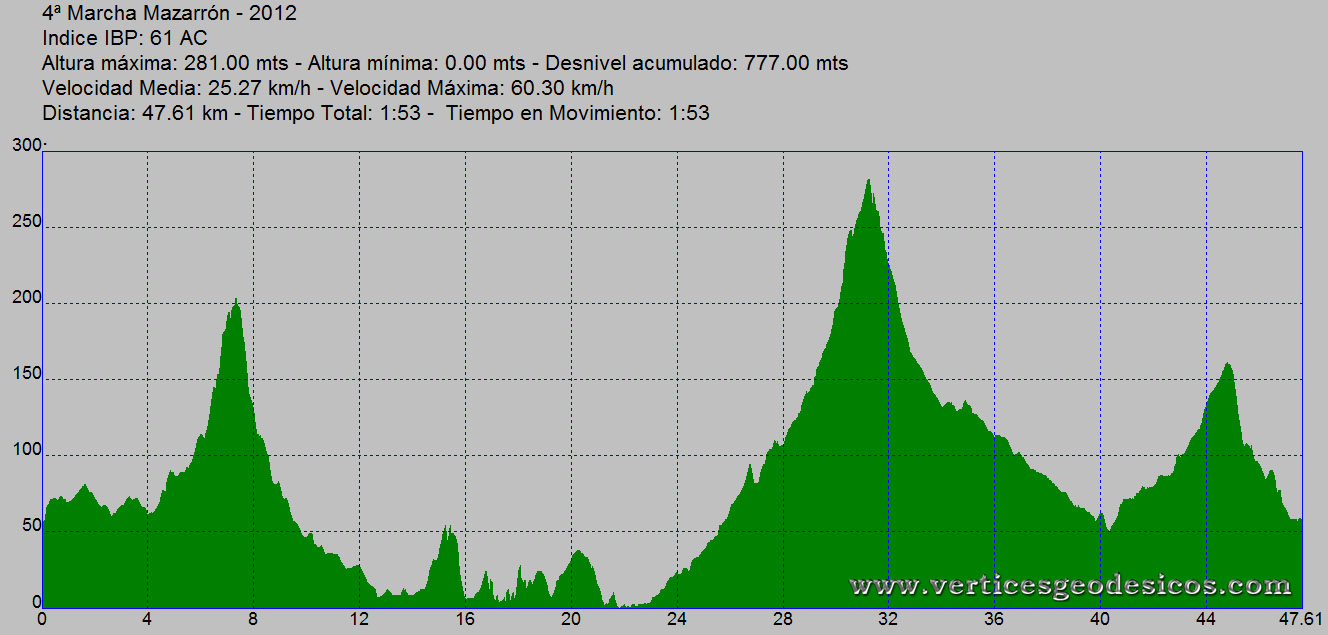 | 4ª Marcha Costas Mazarrón | Marcha | 04/03/2012 | Mazarrón (Murcia) | 61 | 777 m | 47 | ||||