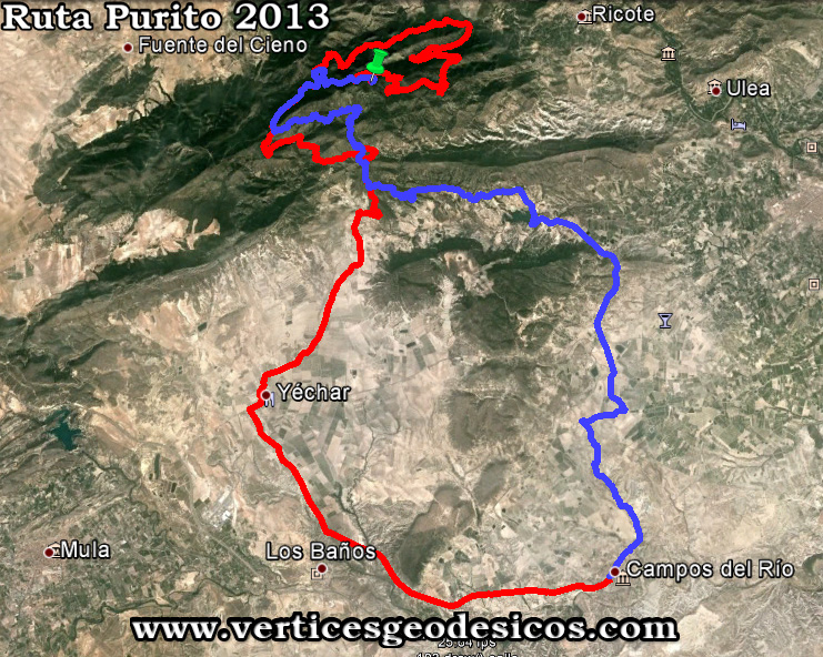 Salida y llegada en Campos del Río, comenzamos por la Vía Verde del Noroeste hacía el pueblo de Yechar, allí nos dirigimos hacía la Sierra Ricote desde Patruena. Pasamos por la casa forestal de la Solana, seguimos hacía el Collado del Moro dirección el Collado de Linuesa, llegamos al asfalto que sube a lo más alto de la Sierra, pero de momento no subimos más, descendemos dirección el pueblo de Ricote por una buena pista que pasa por la conocida Piedra Lisa.
