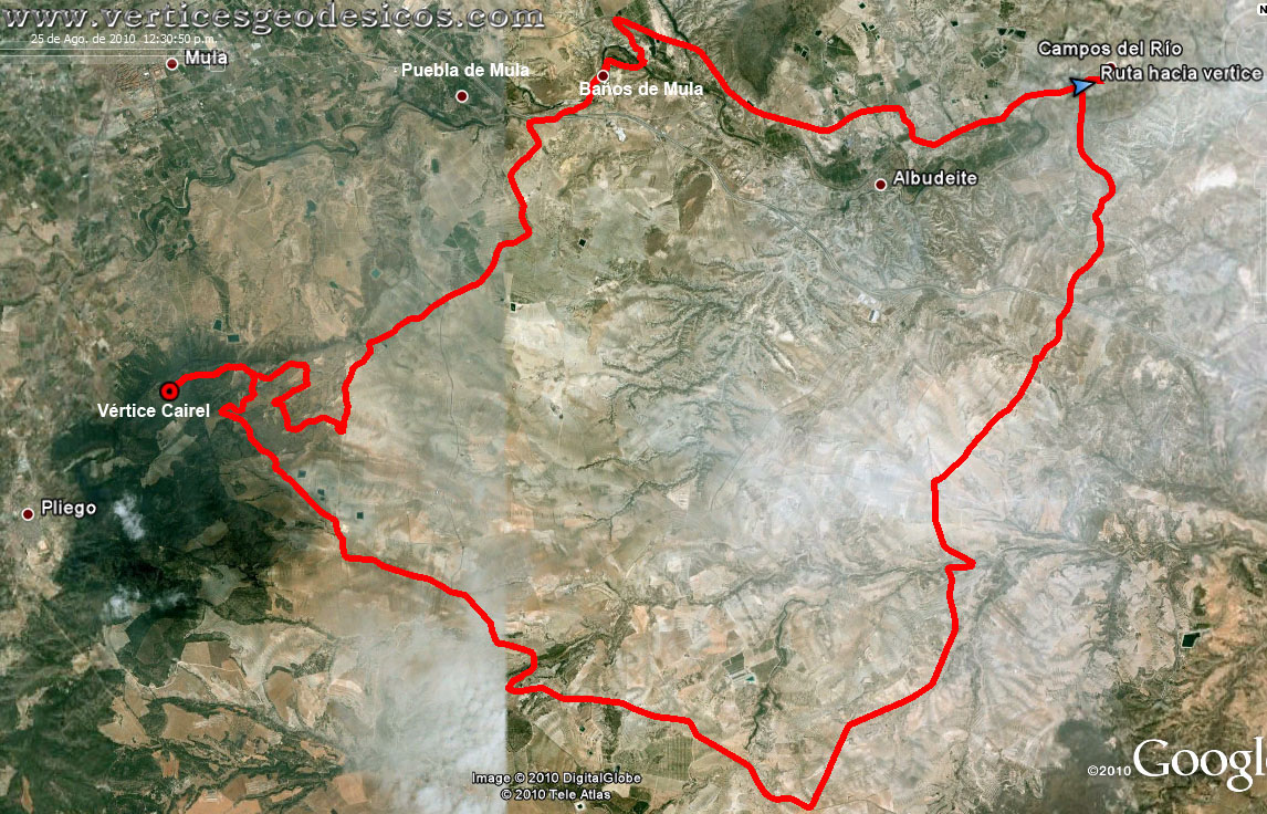 Salida y Llegada en Campos del Rio. Dirección la autovía del Noroeste subimos hacia el Barril, cruzamos el puente de la autovía y nos dirigimos de frente hacía un camino que nos lleva a la finca de los Charcos. Ahora dirección Barqueros cruzamos la Rambla salada. En Barqueros seguimos dirección Los Calderones y posteriormente hacía Pliego. Dejamos el asfalto para entrar a realizar un rato de MTB, donde lo único destacable es el monte Cairel y sus vistas de Pliego y Mula. Ya estamos en nuestro objetivo, el vértice Cairel.