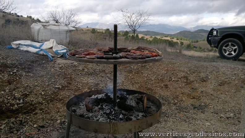 Hoy solo nosotros dos subimos a este vértice, tanto el Barros y los maestros que subieron en 2009, en esta ocasión ya estaban pensando más en la barbacoa que en la hazaña. Ahora comenzamos la bajada, pero solo unos metros, ya que en enseguida estamos en la Seta verde, donde nos espera una maravilla de Almuerzo.