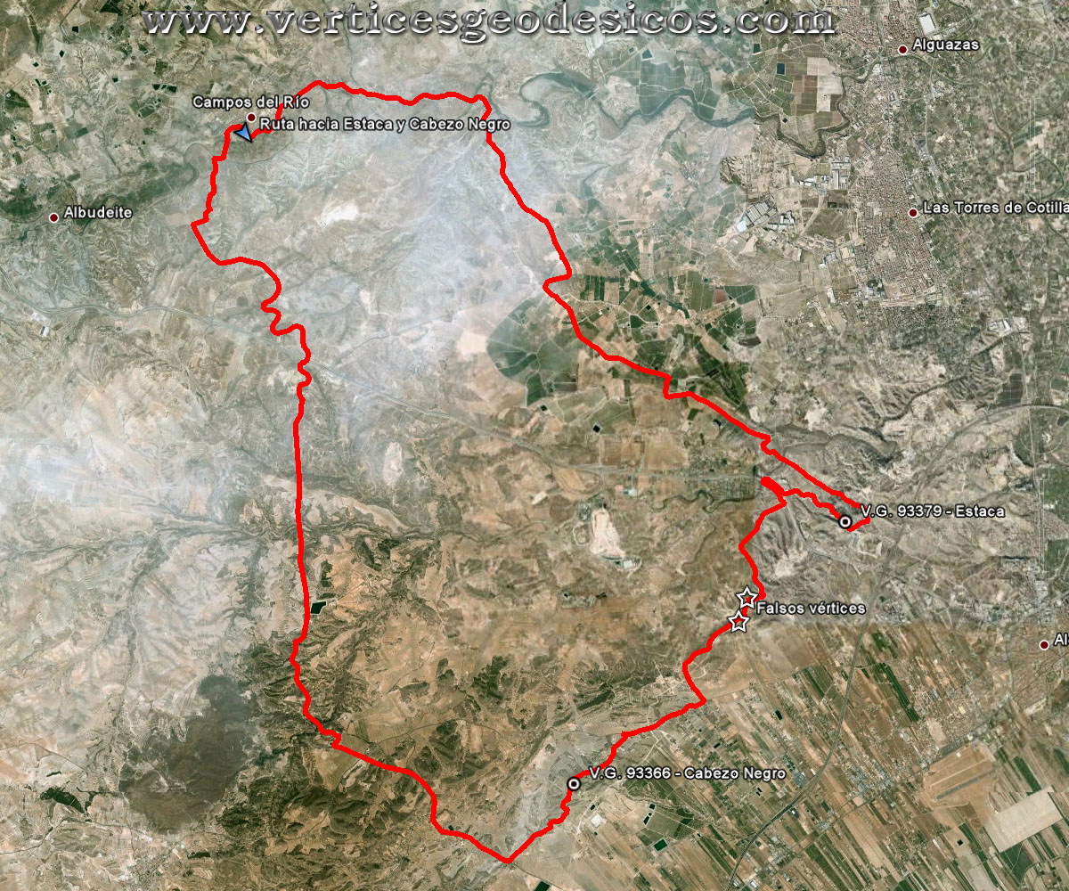 Salida y Llegada en Campos del Río. Desde el Bar Deportivo salimos por la vía verde del Noroeste dirección Alguazas, llegamos a los Rodeos donde abandonamos la vía verde para continuar por camino de asfalto dirección "Lo Cortao". Por caminos rurales, dirección Cañada Hermosa, llegamos a nuestro primer vértice llamado Estaca.