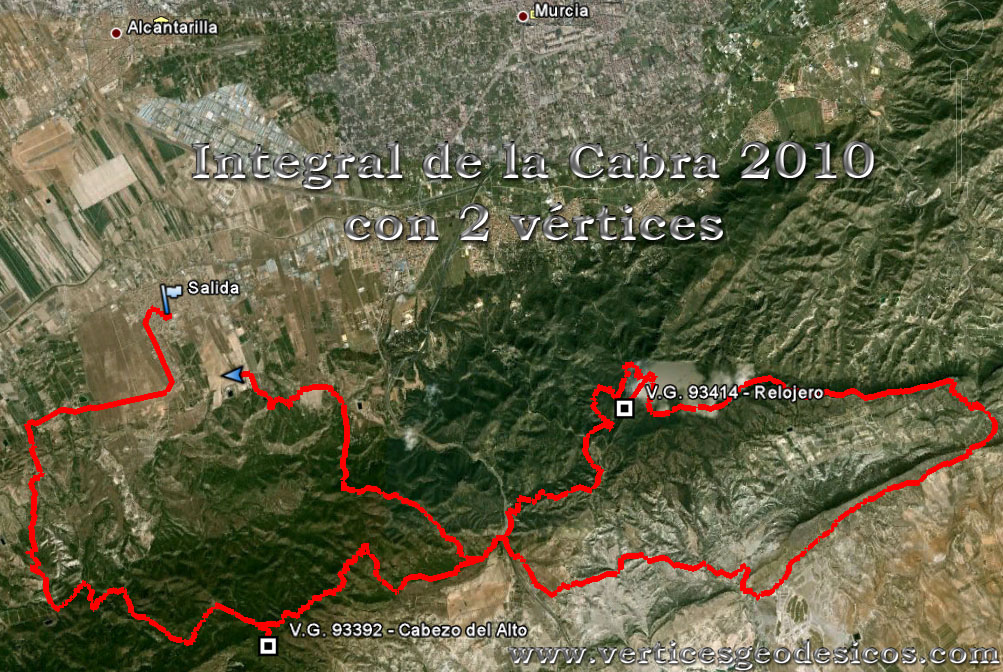 Nuestros amigos de www.rutasmtbmurcia.com llevan varios años realizando una marcha de MTB no competitiva denominada "Integral de la Cabra", prueba de especial dureza. El año pasado participaron Barros y Joaquinator, pero este año decidimos todo el grupo realizar la ruta para conocerla antes de la prueba, nuestra sorpresa cuando vimos que el trazado transcurría muy cerca de 2 vértices, por tanto, decidimos realizar la ruta de la "Integral de la Cabra 2010" pero modificando levemente la ruta para desviarnos y realizar los vértices "Cabezo del Alto" y "Relojero".