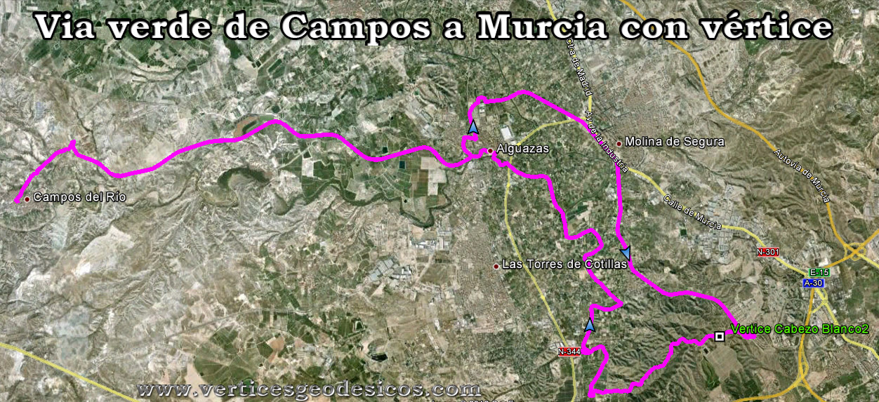Llegamos hasta Alguazas donde la pista acaba en la carretera, giramos a la izquierda dirección Ceutí, pasamos una rotonda y volvemos a girar a la derecha para cruzar la vía por un paso peatonal elevado. Llegamos al puente sobre el río Segura y dejamos Alguazas atrás para pasar por las afueras de Molina de Segura, Torre Alta, Ribera de Molina hasta llegar a la universidad de Espinardo. En este momento nos desviamos hacia el monte Cabezo Blanco donde visitamos el vértice Cabezo Blanco 2.